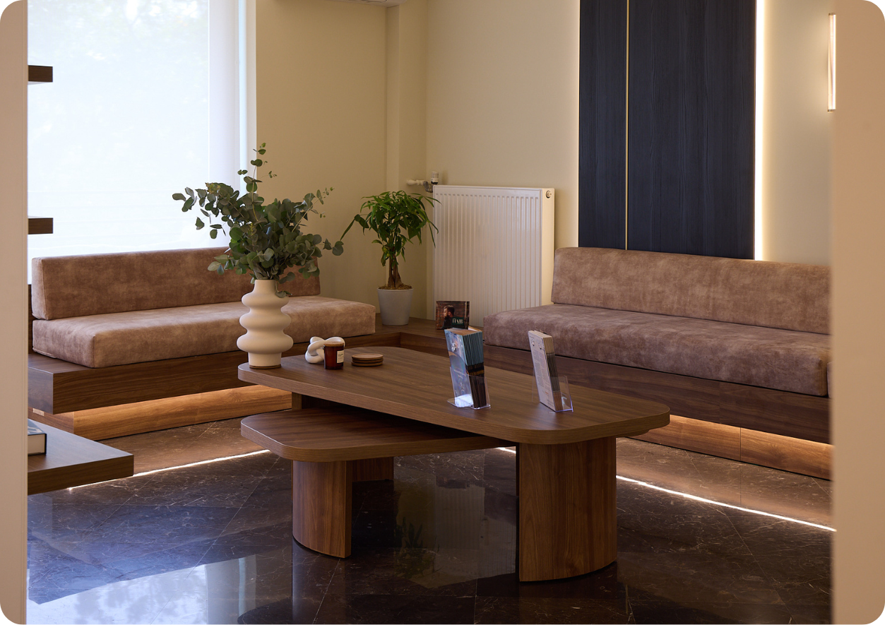 Στο νέο ιατρείο του Δρ. Χάρη Καζάκου κάθε λεπτομέρεια έχει σχεδιαστεί στρατηγικά να δημιουργεί αίσθημα απόλυτης ασφάλειας και οικειότητας. Ζεστοί τόνοι, φυσικά υλικά, ήπιος φωτισμός και minimal design μετατρέπουν την παραμονή στο χώρο σε εμπειρία ανανέωσης.